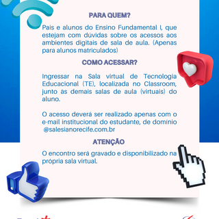 Amanhã (05/02), a partir das 14h, estaremos promovendo um encontro com Joselma Silva, coordenadora do Núcleo de Tecnologia Educacional do Colégio Salesiano. O momento foi pensado para esclarecer possíveis dúvidas sobre os acessos aos ambientes digitais de sala de aula.